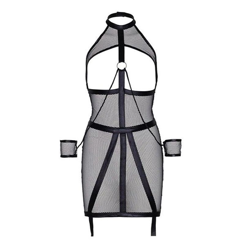 Crna haljina robinje dizajnirana je tako da je uz telo, providna i ojačana harness trakama. Otvorena je u predelu grudi, što omogućava potpuno i bezrezervno istraživanje vaših fetiš fantazija. Haljina ima halter nastavke, pa se savršeno slaže sa mrežastim čarapama ili drugim seksi detaljima koji će dodatno naglasiti vašu senzualnost.