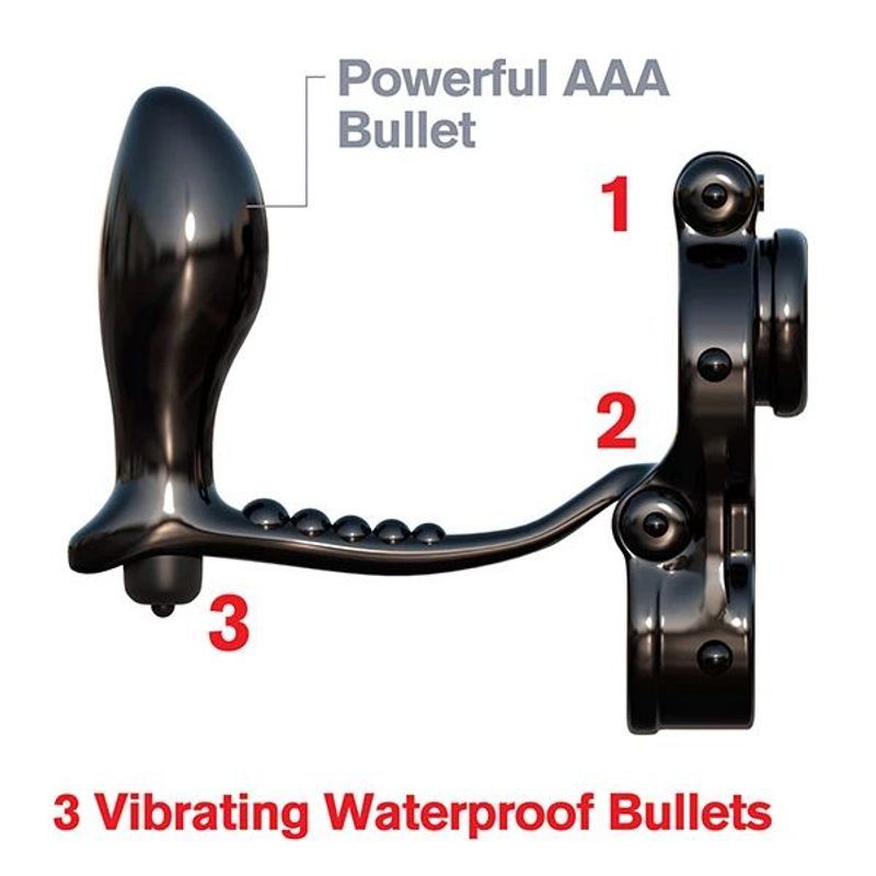 Kao kompletno oružje za nezaboravne erotske trenutke, predstavlja kombinaciju masažera tvoje osetljive G tačke i prstena za penis i testise sa svojih 3 mikro vibro metka. Sve ovo ti obećava kameno tvrde erekcije, produženi odnos i neverovatnu napaljenost. Tvoji testisi i penis će biti pritisnuti i stvrdnuti, dok ti se u guzi dešava sjajna erupcija zadovoljstva.