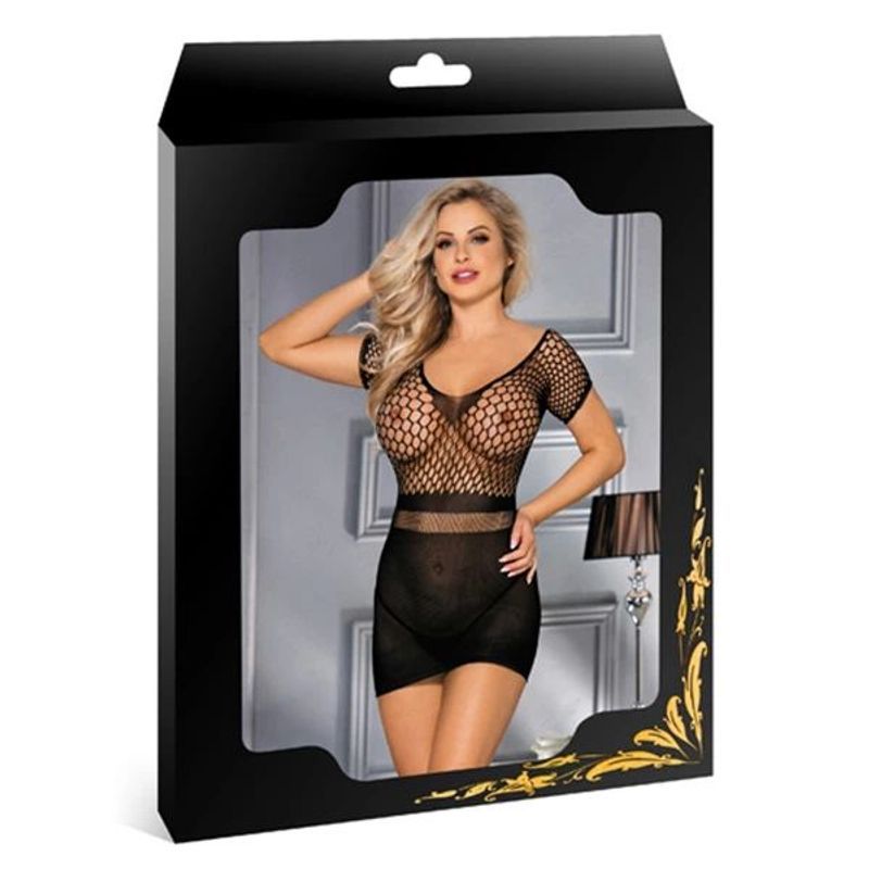 Naša sexy haljina je dizajnirana tako da savršeno pristaje uz telo, dodatno naglašavajući tvoje obline. Gornji deo sa kratkim rukavima i širokim izrezom napred i nazad, izrađen od provokativne mrežice, pruža ti priliku da se osećaš izazovno i samouvereno. Od struka je materijal puniji, što čini tvoju figuru izduženijom i vitkijom, dok su grudi posebno istaknute kako bi privukle pažnju na pravi način.