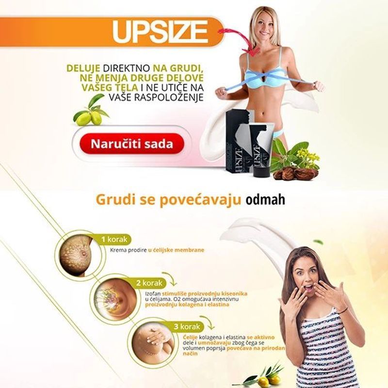 Upsize krema za povećanje i podizanje grudi je potpuno novi način sigurnog i efikasnog povećanja grudi. Naglašavamo sigurnost jer je to kamen temeljac medicine, čak i kada mladi pacijenti ne misle na to. Ako svakodnevno koristiš kremu, volumen tvojih grudi će se povećati za 3-4 nedelje, grudi će postati okrugle i čvrste, koža će biti elastična i baršunasta.